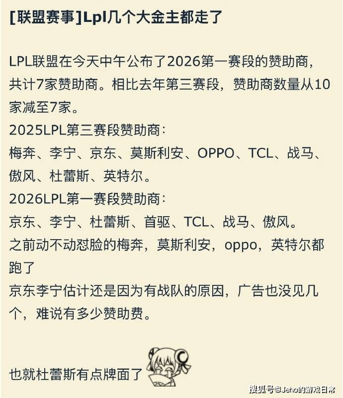 最后想问问大家:你对此次LPL赞助商变动有什么看法?你觉得哪些品牌适合加入LPL赞助阵容?欢迎在评论区聊聊!返回搜狐,查看更多
