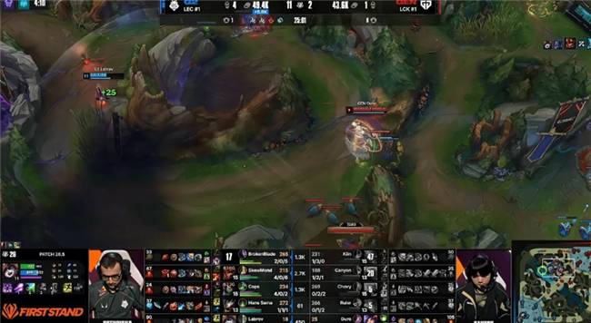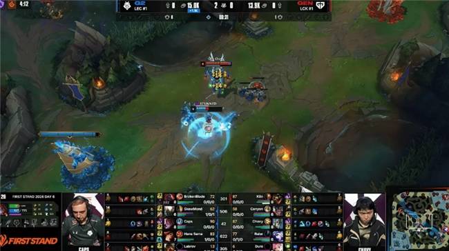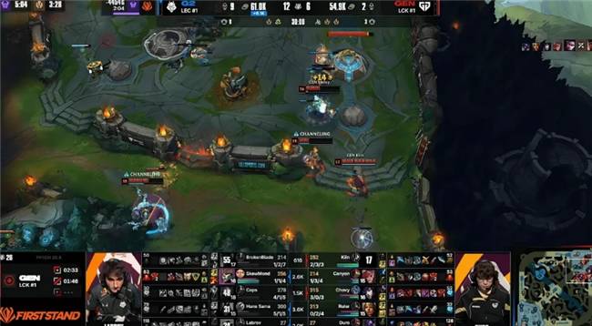 本场比赛,G2战队在蓝色方,GEN战队在红色方。阵容方面,G2战队选择:BrokenBlade奎桑提;SkewMond亚恒;Caps维克托;Hans Sama韦鲁斯;Labrov布隆,GEN战队则是:Kiin薇恩;Canyon蔚;Chovy阿狸;Ruler希维尔;Duro牛头,本局比赛第4分钟,Hans Sama果断闪现躲掉牛头WQ二连,G2下路完成线三人果断越塔,Labrov极限点燃烫死Ruler!