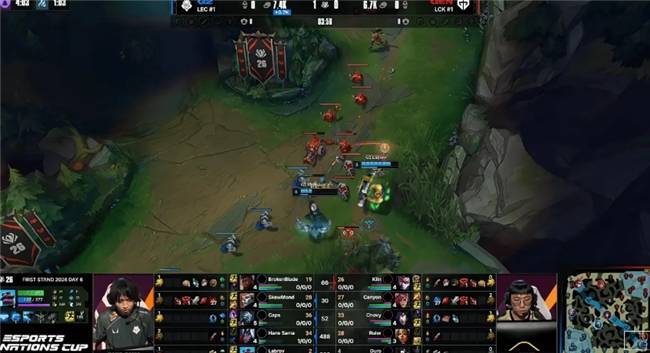 本场比赛,G2战队在蓝色方,GEN战队在红色方。阵容方面,G2战队选择:BrokenBlade慎;SkewMond皇子;Caps阿卡丽;Hans Sama大嘴;Labrov露露,GEN战队则是:Kiin格温;Canyon狼母;Chovy沙皇;Ruler芸阿娜;Duro妮蔻,本局比赛第6分钟,Canyon被打残状态,Caps拿下一血SkewMond拿下小龙。10分钟,Kiin格温深入敌方野区,G2上野果断留人击杀Kiin。11分钟,双方辅助完成互换,但G2占住阵型拿下第二条小龙!
