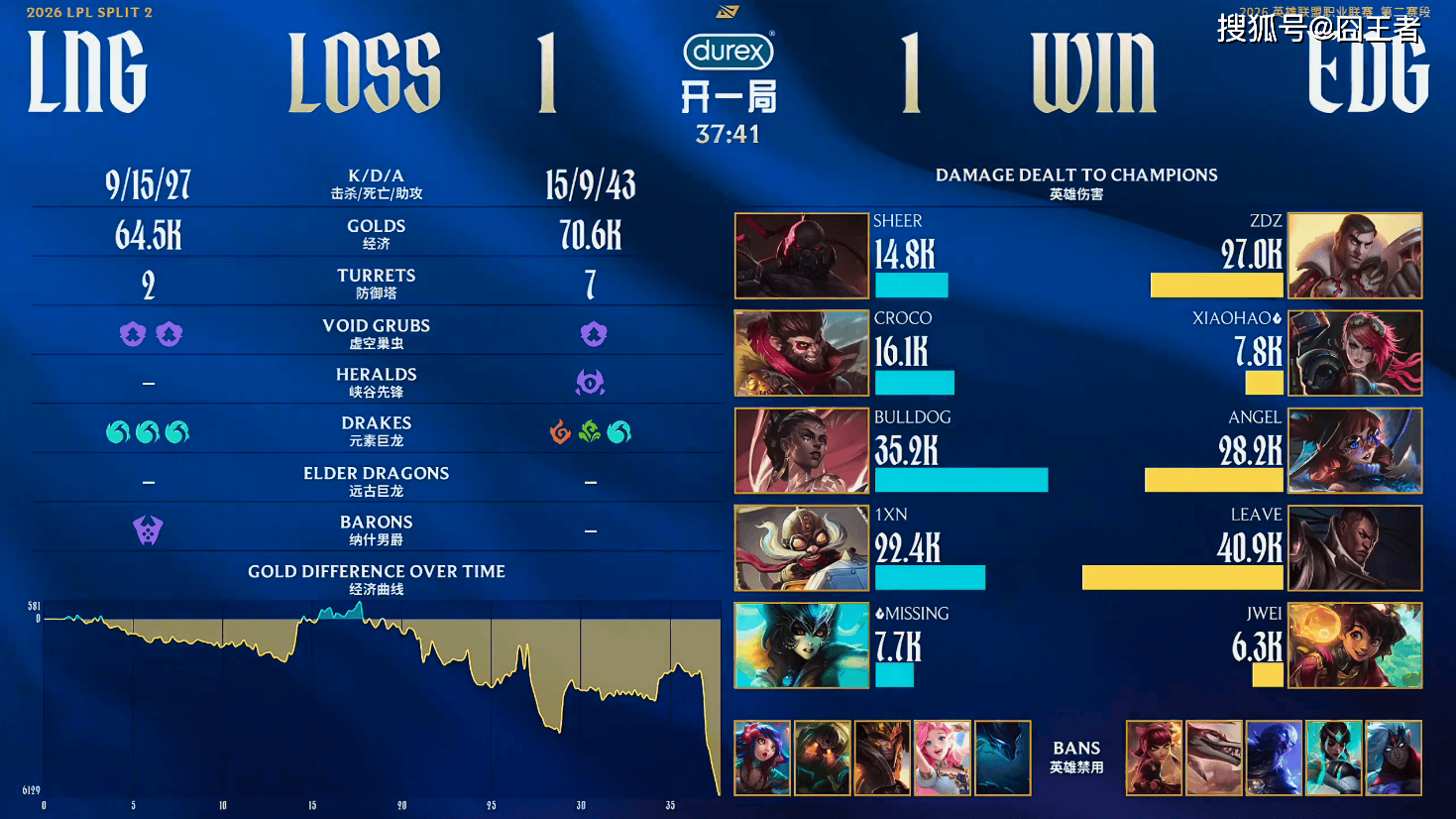 结果第一局比赛,双方各打了半场好局,这一次又是EDG领先不会打比赛,LNG笑到了最后。10分钟,潘森来下拿到月男一血;12分钟,LNG拿下小龙并击杀潘森;15分钟,芸阿娜骑脸输出击杀锤石;28分钟,LNG偷掉大龙,此时EDG最高时,领先4000多经济;31分钟,两队中路交锋,LNG打出1换3;35分钟,沙皇野区被击杀,LNG拿下大龙;最终39分17秒,中路团战LNG打出2换4,随后顺利一波。