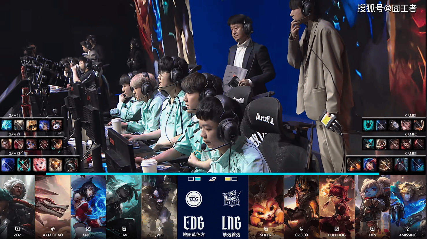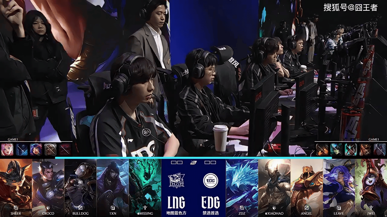 第一局比赛,LNG蓝色方,禁用:歌姬、梦魇、妮蔻、狼母、奥恩,选用:Sheer兰博、Croco赵信、BullDoG发条、1xn月男、Missing锤石;EDG红色方,禁用:泰坦、娜美、扇子妈、皇子、韦鲁斯,选用:Zdz冰鸟、Xiaohao潘森、Angel沙皇、Leave芸阿娜、Jwei露露