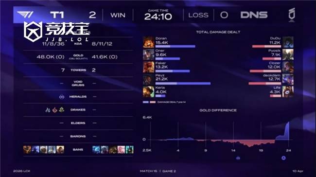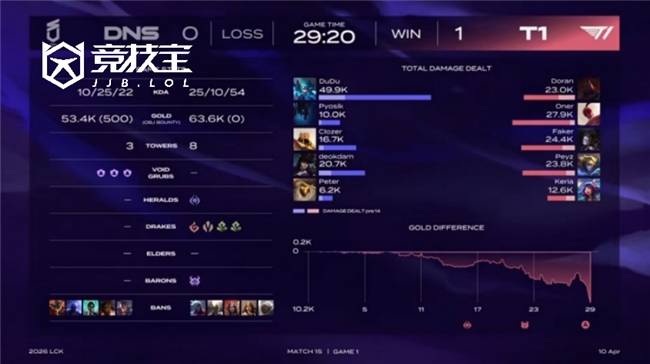 比赛前期,Pyosik梦魇在上河道连续两次被T1中野抓到节奏,局势逐渐倾斜。但对线端DuDu格温展现强势压制力,成功单杀Doran赛恩,打开上路突破口。随后Oner盲僧转战下路完成gank,再次击杀DNS双人组,帮助T1建立起接近3k的经济领先进入中期,DuDu格温在下路再次单杀Doran赛恩,并顺势推掉一塔,个人表现极为亮眼。小龙团中,Keria妮蔻进场控住多人却被集火击杀,但Oner盲僧完成关键收割拿下四杀,T1打出2换4并听牌炼金龙魂。随后上路团战,T1继续扩大优势,打出1换3并收下大龙,经济领先来到7k。后期龙魂团中,DuDu格温进场被瞬间集火,T1顺利拿下炼金龙魂。最终T1中路推进,一波结束比赛拿下首局胜利,Oner盲僧全场砍下12击杀成为关键先生。