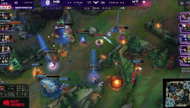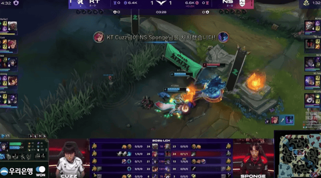 本场比赛,KT战队在蓝色方,NS战队在红色方。阵容方面,KT战队选择:PerfecT狼母、Cuzz蔚、Bdd狐狸、Aiming炸弹人、Effort牛头,NS战队则是:Kingen亚恒、Sponge梦魇、Scout塞拉斯、Taeyoon芸阿娜、Lehends露露,本局比赛第2分钟,NS中野配合击杀狐狸。3分钟,梦魇试图故技重施,但被击杀,牛头在下路被线分钟,塞拉斯在中路被击杀。14分钟,NS团战一触即溃,狐狸团战收获四杀!