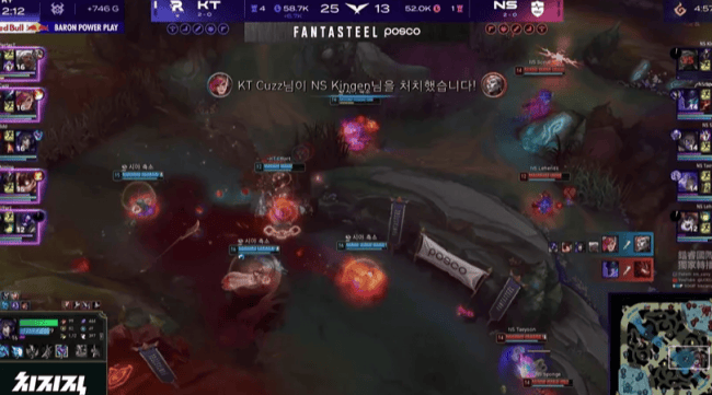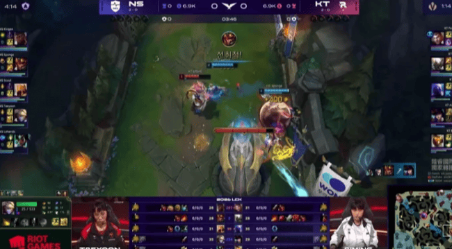 本场比赛,NS战队在蓝色方,KT战队在红色方。阵容方面,NS战队选择:Kingen奎桑提、Sponge皇子、Scout沙皇、Taeyoon EZ、Lehends扇子妈,KT战队则是:PerfecT杰斯、Cuzz潘森、Bdd瑞兹、Aiming女警、Effort巴德,本局比赛第3分钟,皇子来下击杀KT下路双人组。7分钟,KT打野来下却只打出1换1。9分钟,潘森在野区阵亡。17分钟,EZ在野区被抓。19分钟,KT在野区打出0换3,EZ又被抓掉!