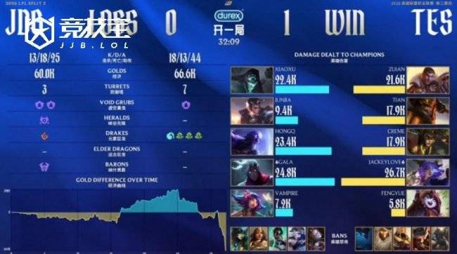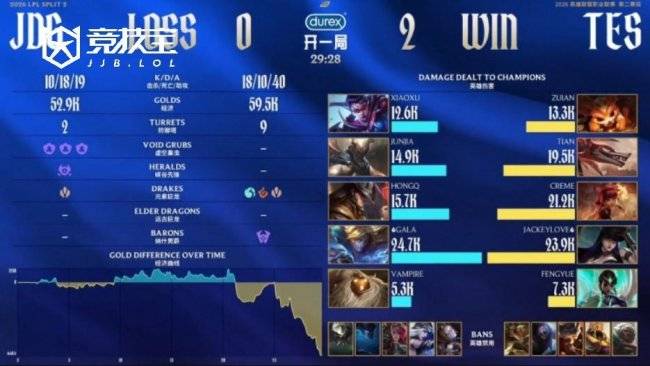 前期Tian皇子节奏拉满,快速支援上路帮助杰斯击杀掘墓拿下一血。JDG随后展开反击,瑞兹联动掘墓完成越塔击杀,同时TES在下路也由皇子找到机会击杀韦鲁斯,双方节奏不断交换。进入中期,先锋团成为转折点,妮蔻果断开团命中多人,掘墓绕后打出高额伤害,JDG打出2换4并顺势推掉上路一塔,占据主动权。紧接着小龙团战,妮蔻再次完成关键绕后开团,JDG再打2换4并收下大龙,经济领先接近4k。不过TES韧性十足。后期关键团战中,JackeyLove操刀芸阿娜打出爆炸输出,大招进场直接收获双杀,帮助队伍完成2换4。随后JDG选择五人抓上并动大龙,TES在少人情况下正面硬接团战,JackeyLove持续输出压制全场,TES再度打出2换4,一波终结比赛先下一城。
