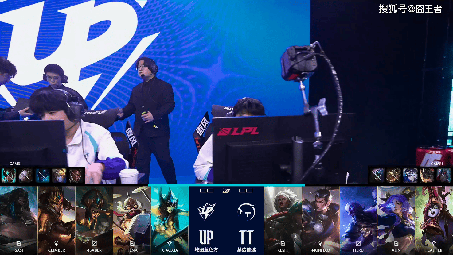 第一局比赛,UP蓝色方,禁用:卡尔玛,发条,梦魇,EZ,卢锡安,选用:sasi乌迪尔,climber皇子,Saber蛇女,Hena飞机,Xiaoxia娜美;TT红色方,禁用:韦鲁斯,兰博,寒冰,鳄鱼,武器,选用:Keshi狼母,Junhao赵信,Heru瑞兹,Ahn芸阿娜,Feather璐璐