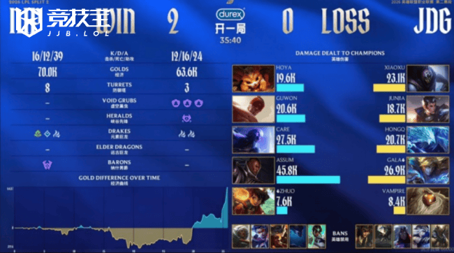 第二局前期双方节奏交替,互有攻守。中期NIP率先控下三条小龙,占据资源优势。JDG则依靠HongQ冰鸟与xiaoxu贾克斯的控制链打出几波漂亮反击,一度将局势拉回。虽然NIP成功拿下大龙,但被JDG强行留住四人,收益大打折扣。关键转折出现在随后的龙团,Guwon盲僧精准切入后排完成击杀,帮助队伍重新掌控局势。决胜团中,Guwon盲僧与Assum卢锡安轮番操作打出爆炸伤害。GALA伊泽瑞尔试图E脸换命却难以撼动卢锡安的输出环境。NIP全力保护核心输出位,Assum持续收割战场,最终团灭JDG,锁定胜局。