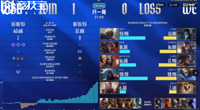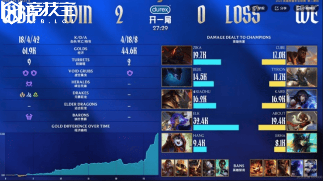开局阶段,WE新打野Tyrion赵信连续两波抓下,帮助下路建立起一定优势。不过WBG很快做出回应,Jiejie蔚连续针对上路,配合Zika安蓓萨完成两波越塔,成功打出对位压制。进入中期,Zika安蓓萨与Xiaohu乐芙兰在边路不断施压,逐步掌控比赛节奏。关键的第四条小龙团战中,WBG依靠上野强势冲阵直接打散WE阵型,打出1换4后顺势收下小龙与大龙,经济差迅速拉开。后期WE尝试反击,三人合力击杀Xiaohu乐芙兰,但下路Cube约里克被击杀导致正面失守。WBG四人抱团推进下路,高地团再次击溃WE,一波结束比赛,先下一城。