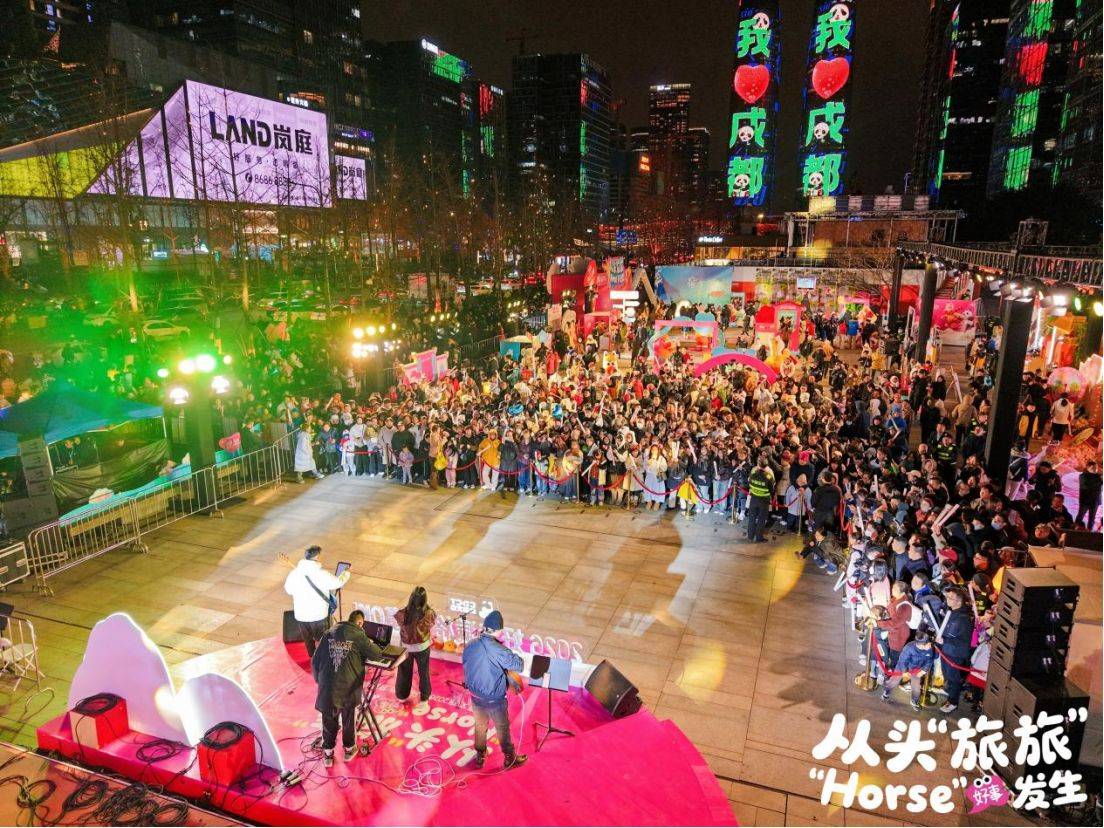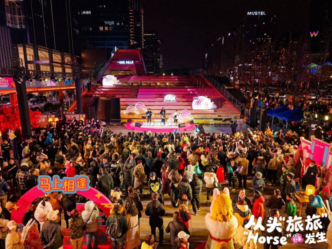8米高的神马气模,4尊毛绒主题神马,8大文旅融合场景,国风舞者与机器人舞团同台的表演吸引着市民与游客,开门即满园,入园人次已在预警当晚的人潮压力。