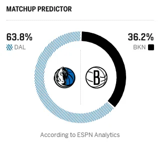 赛前,美媒ESPN预测本场比赛,独行侠胜率63.8%,篮网胜率36.2%。