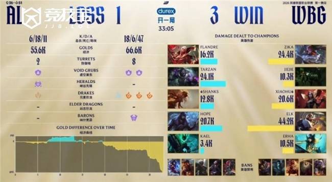 本局Jiejie选出狼人打野成为比赛焦点。前期Kael锤石在F6隔墙钩中Xiaohu妖姬,Tarzan蒙多跟上输出成功击杀。随后的小龙团中Jiejie狼人虽然拿到小龙,但被Flandre吸血鬼追击击杀。不过不久后Flandre在下路吃线时又被复活赶到的狼人扑脸击杀,WBG经济小幅领先约1k。中期AL在中路放出先锋,但Shanks岩雀封墙失误挡住自家先锋撞塔机会。正面战场WBG拿到小龙并击杀Kael锤石,随后Tarzan蒙多1v4被Xiaohu妖姬击杀,WBG打出0换3将经济领先扩大至1.2k。不久后Tarzan蒙多再次被Jiejie狼人扑脸击杀,WBG优势来到3k。进入后期小龙团,Jiejie狼人关键抢下小龙,WBG打出1换2顺利听牌火龙魂。随后大龙团王杰厄斐琉斯被Elk飞机远程消耗击杀,WBG打出0换4并顺势拿下大龙与火龙魂,经济领先来到6k。最终WBG从上路推进,团战中瞬间融化AL四名成员,一波结束比赛,以3-1淘汰对手晋级败者组决赛。