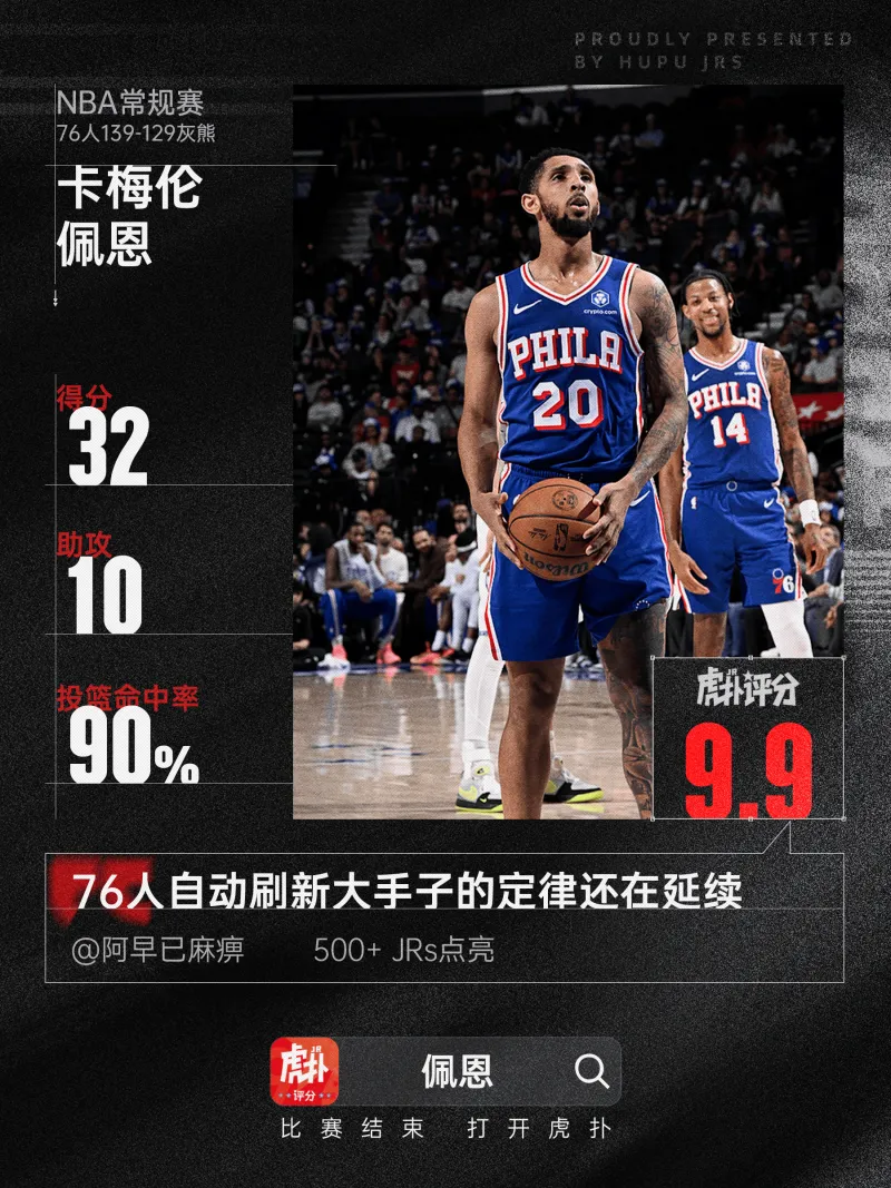 本场比赛,76人球员卡梅伦-佩恩出战30分钟,10投9中,其中三分球8投8中,罚球6投6中,得到32分3篮板10助攻3抢断2封盖。