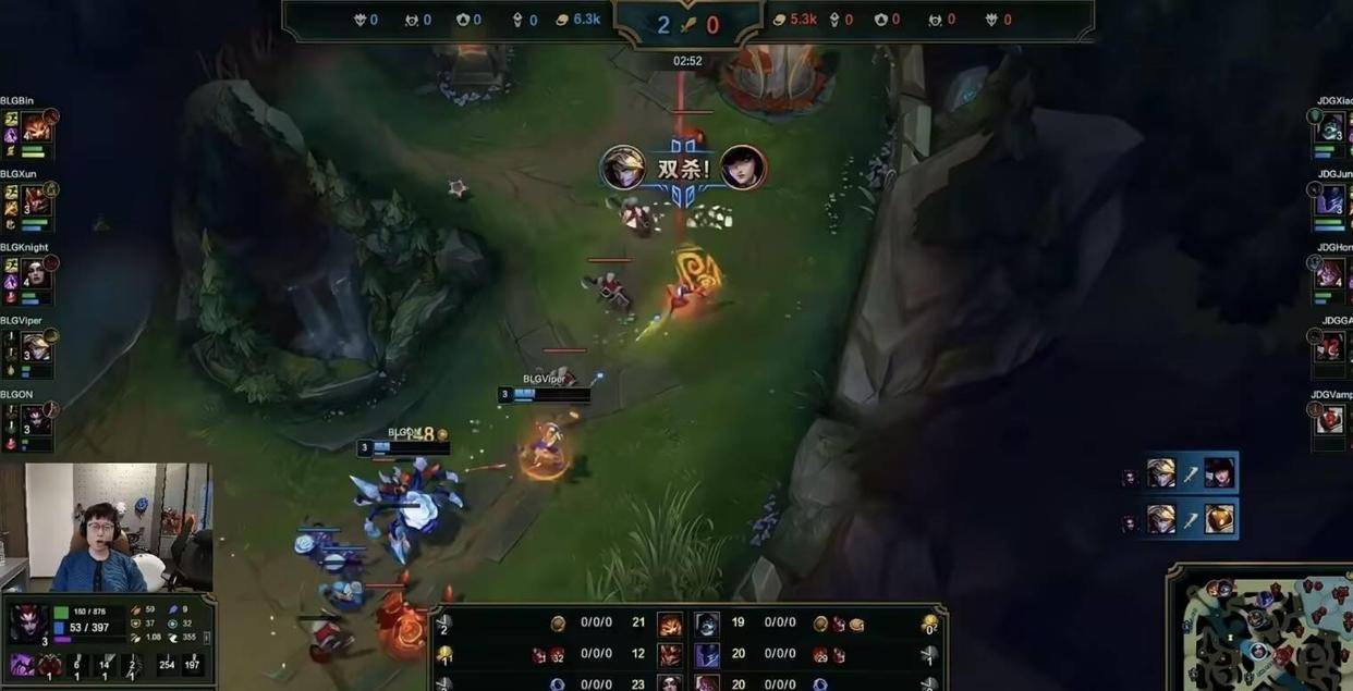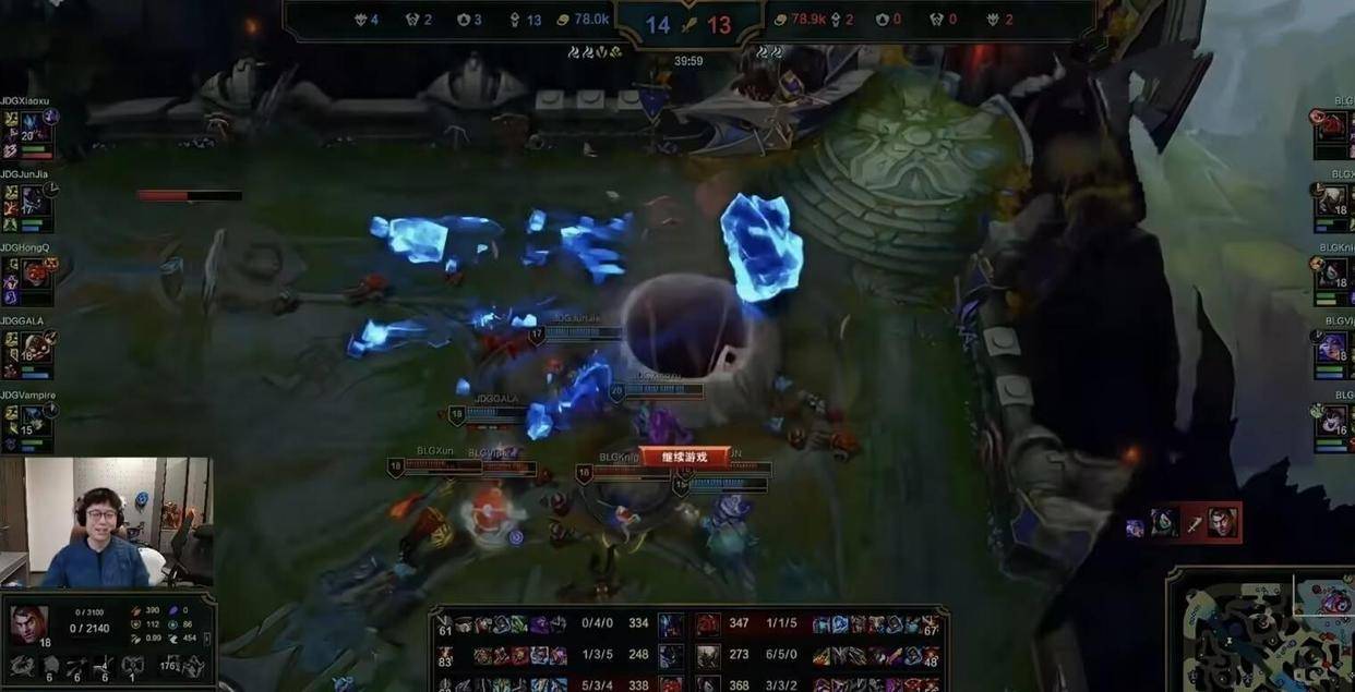 然而,就在此时,小徐开始了他的“表演”。在带线过程中,他连续被抓,无情地将人头送给Viper。26分钟,JDG突然做出一个令人匪夷所思的决定,在对方无人阵亡的情况下强行开打大龙,结果除了嘎子之外,全员阵亡。BLG抓住机会,吞下大人头,经济逐渐反超。比赛的悬念又回来了。